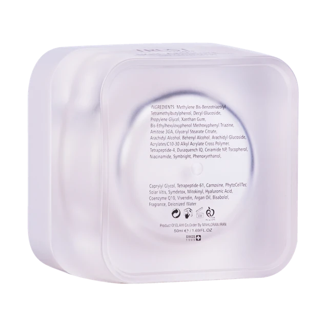 - مهار کننده پرتوهای UV و روشنکننده پوست با داشتن ترکیبات فعال آمیتوز 3GA، نیاسینآمید، سیمبرایت، سیمدتوکس و میتوکینیل