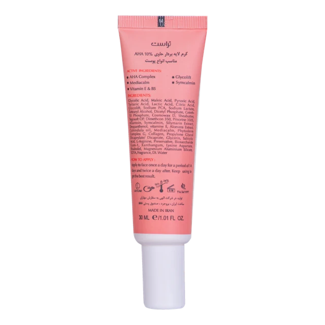 کرم لایهبردار تراست حاوی ۱۰ درصد آلفا هیدروکسی با لایهبرداری سلولهای پیر و فرسوده، قدرت بازسازی پوست را به آن بازمیگرداند تا علاوه بر کم شدن میزان چینوچروکهای سطحی، پوستی یکدست، شفاف، جوان و روشن پیدا کنید.
